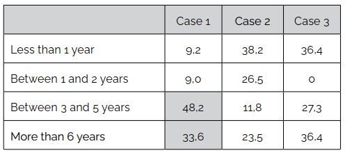 Another confirmed aspect was the stability of the center's academic staff. When considering this variable, it is assumed that the longer they have been working in the center, the higher the number of ties. In this regard, it is verified that Case 1 has a more stable academic staff than the others because the higher percentages are in the most senior groups (Table 2).