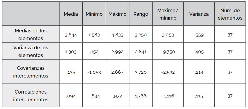 El Cuestionario, remitido online autoadministrado, contenía instrucciones sobre su contenido, esto es, una serie de enunciados orientados a diversos aspectos de la práctica profesional docente, aclarando que no existían respuestas correctas o incorrectas ni se trataba de un ejercicio con fines de evaluación. Conviene precisar que, una vez recibidas las respuestas, fueron analizadas mediante el Statistical Package for the Social Sciences (SPSS), a fin de asegurar la consistencia interna de los ítems, en correspondencia con la medición estándar del coeficiente Alfa de Cronbach, que arrojó un estadístico aceptable al correr los datos de todo el instrumento y cada uno de los elementos individuales, por su covarianza y correlación, presentados en las siguientes tablas: