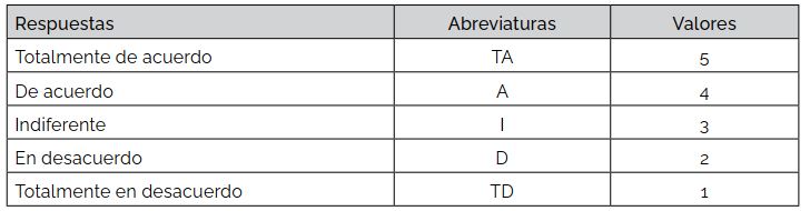El análisis de los datos se basó en una Escala Tipo Likert, por ser un procedimiento simple e intuitivo, cuyo esquema de reacción y fácil aplicación permite al sujeto aprender rápidamente el sistema de respuestas. Una de sus principales ventajas es que todos coinciden y comparten el orden de las expresiones (Likert, 1932). Es una escala ordinal de tipo aditiva que mide parámetros actitudinales hacia determinados fenómenos o situaciones (Matas, 2018). En este caso, los sujetos indicaban si estaban de acuerdo o en desacuerdo con un conjunto de ítems en forma de afirmaciones, jerarquizadas con números ordinales, acorde con la siguiente tabla: