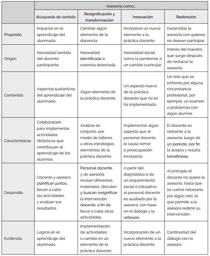 En las narraciones de las experiencias vividas y en la Tabla 1, la asesoría, aunque sea una práctica desarrollada para mejorar las prácticas docentes, tiene características diferentes de acuerdo con el propósito por el que se realice, no solo de parte de la asesora, también por el margen de acción, el diálogo e interacción con el personal docente, el apoyo que ella recibe de parte de otros actores educativos y de las condiciones de su intervención (tiempos, espacios y disposición, entre otros).