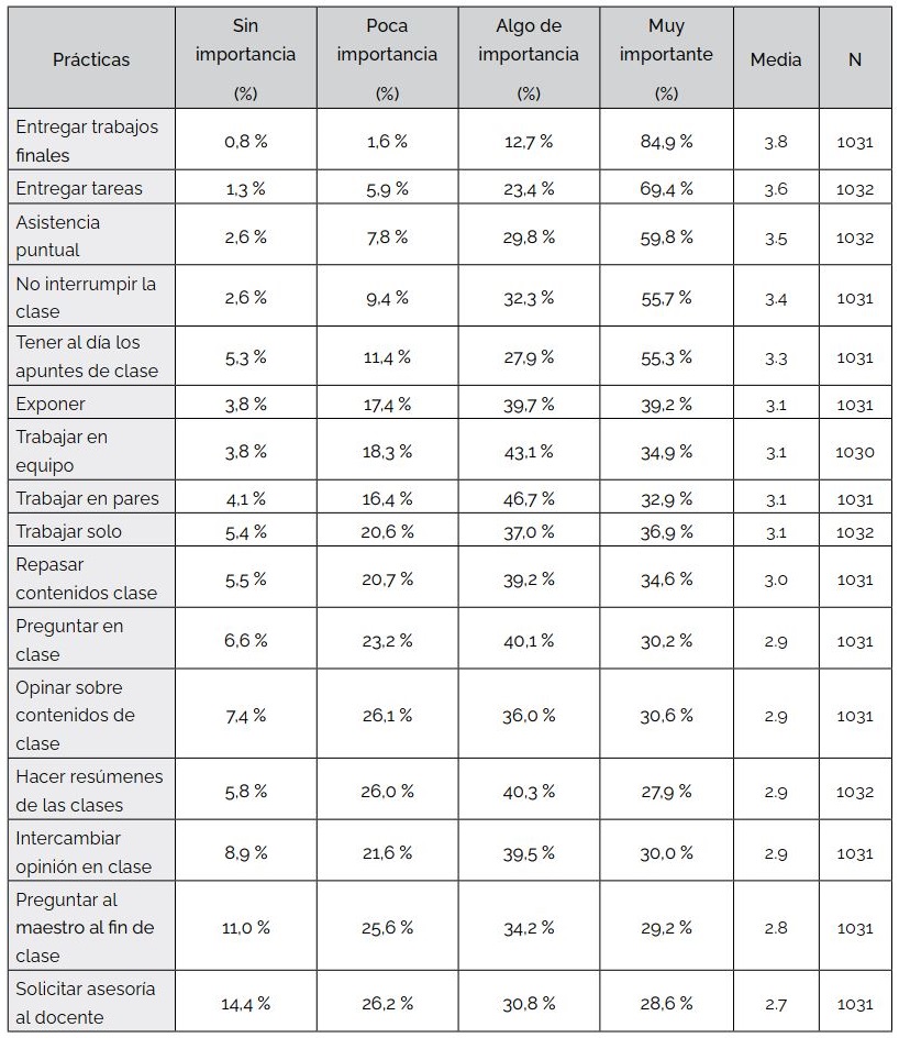 Tras contrastar la información, además de realizar pruebas de correlación, se detallan los resultados referentes a las prácticas regulares. En la aproximación a la fase de incorporación se busca dar cuenta de la clasificación y jerarquización de dichas prácticas por parte de los estudiantes. Para realizar lo anterior, se analiza la información obtenida tras preguntar a los estudiantes qué tan importante consideraban cada una de las prácticas de la Tabla 3.