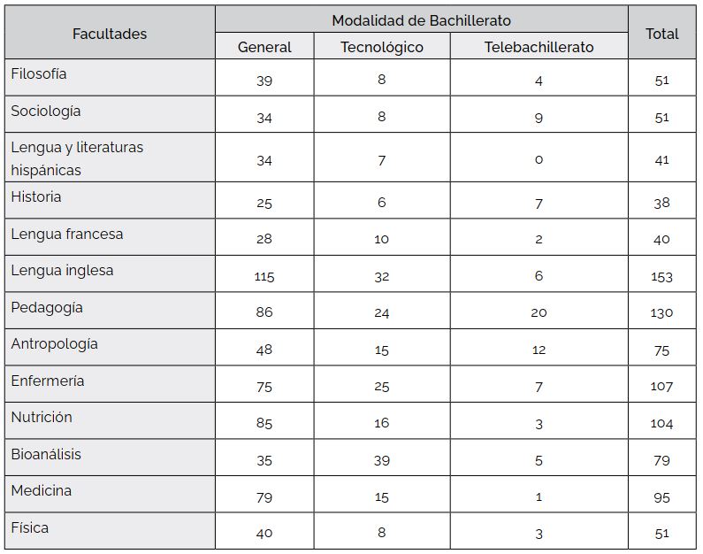 En total son 1033 casos, de los cuales, 1015 indicaron adecuadamente su procedencia de alguna modalidad de bachillerato. Para el tratamiento de los datos se empleó el cálculo de medias, además de pruebas de correlación, mediante el software orientado al análisis estadístico en ciencias sociales (SPSS por sus siglas en inglés).