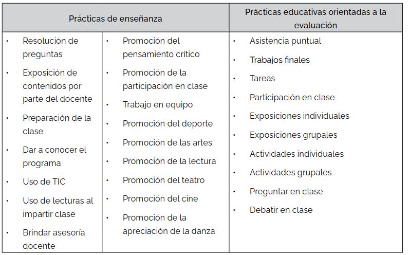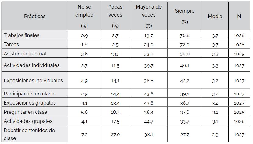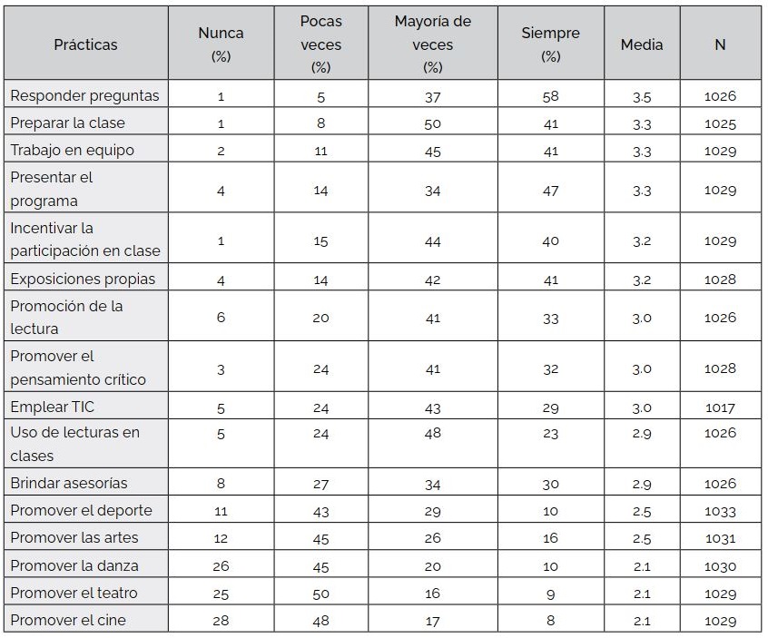 Con la intención de abarcar un conjunto de prácticas registradas en investigaciones precedentes, a fin de identificar las prácticas generales a las que los estudiantes fueron expuestos durante su tránsito por el bachillerato, se les cuestionó sobre la frecuencia con la que sus docentes emplearon el conjunto de prácticas de la Tabla 2.