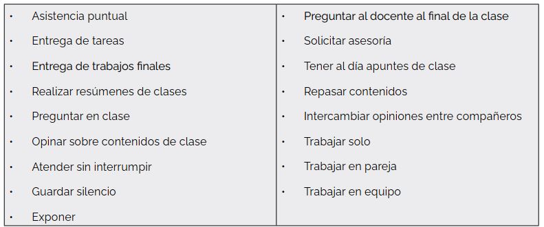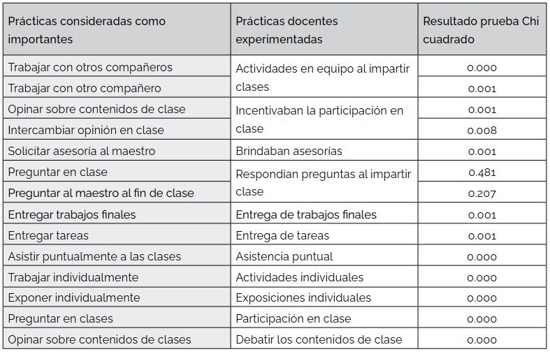 La segunda característica es la coincidencia en valorar prácticas asociadas con una mínima interacción e intercambio entre estudiantes y docentes, tales como la asistencia puntual, no interrumpir en clases y tener al día los apuntes. Prácticas de ese tipo guardan relación con una educación pasiva, la cual ha sido registrada dentro del NMS (Escalante et al., 2015). En complemento de lo anterior, considerando los datos obtenidos en este estudio, los valores más bajos respecto a las medias los representan prácticas asociadas con una mayor participación por parte del estudiante.
