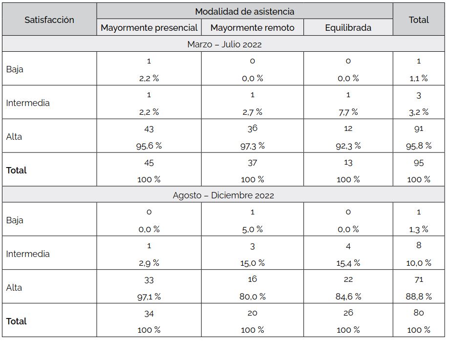 La Tabla 3 indica que quienes cursaron MNC bajo HyFlex en el primer período con asistencia mayormente presencial, 95,6 % manifestó tener una satisfacción alta con el curso, situación que se mantuvo en el segundo período donde se reporta un nivel del 97,1 %. Este porcentaje no presenta variaciones significativas cuando el modo de asistencia es mayormente remoto o en forma equilibrada, donde en marzo-julio se ubicaron en 97,3 % y 92,3 % respectivamente, mientras que en agosto-diciembre fueron 80 % y 84,6 %. En el nivel de satisfacción intermedio no existen diferencias porcentuales considerables en los que participaron mayormente remoto y en forma equilibrada, por lo cual, tienen una satisfacción equivalente, mientras que el porcentaje de insatisfacción es muy bajo.