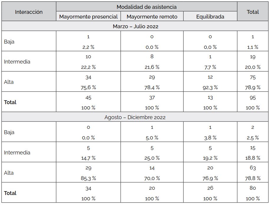 La Tabla 4 muestra que el 75,6 % de estudiantes del primer período con asistencia mayormente presencial percibieron un nivel alto de interacción con su docente y con sus pares, situación que se mantuvo en el segundo período donde este nivel se ubicó en 85,3 %, lo que indica conformidad en la interacción docente-estudiante y en la forma como se promovieron los intercambios comunicacionales con el resto del grupo. El nivel alto de interacción, en ambos períodos, presenta una leve disminución porcentual con quienes tuvieron una participación mayormente remota o en forma equilibrada. En cuanto a los que percibieron interacción intermedia, los porcentajes son inferiores si se compara con el nivel alto. Además, son mínimos los porcentajes de estudiantes inconformes con las diferentes interacciones producidas en el curso, a pesar de su modalidad de asistencia.