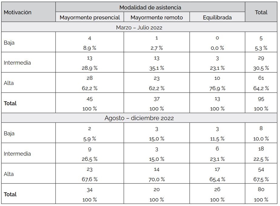 Según la tabla 5, el nivel bajo de motivación en el primer período académico se ubica en promedio en 5,3 %, mientras que en el segundo período este porcentaje se ubicó en un 10 %. Desde las voces de algunos entrevistados, un factor que puede explicar este hecho tiene que ver con la obligatoriedad de la cámara prendida para los estudiantes remotos, tal y como lo sostiene el informante I3 cuando señala que: “se debe dejar de insistir con la cámara, justo para matemática no sirve, lo entiendo en materias como equipos, recursos humanos o materias sociales, pero de números, para qué”. Otro factor puede relacionarse cuando son forzados a participar en clase, según lo señala I8 quien indica “que la participación en clase de los remotos debe ser más voluntaria y no tan forzada”.