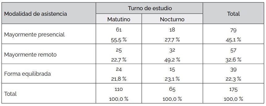 En cuanto a la forma de asistencia a la clase de matemáticas, la Tabla 1 contiene los resultados en conjunto de ambos períodos según el modo de asistencia y el turno de estudio.