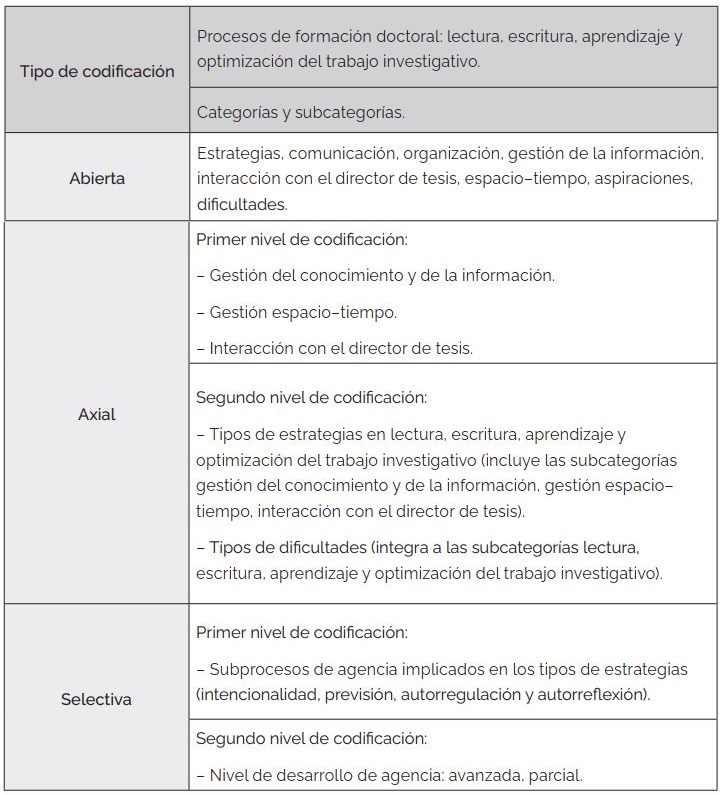 Acorde con el objetivo de la investigación, las respuestas fueron analizadas a profundidad mediante un proceso inductivo que integra la codificación abierta, axial y selectiva, correspondientes a la teoría fundamentada (Strauss & Corbin, 1998), enfocado en la comprensión de las estrategias aplicadas con un sentido de agencia por doctorandos de distintas disciplinas para el desarrollo de la lectura y escritura académicas, el aprendizaje y la optimización del trabajo investigativo.