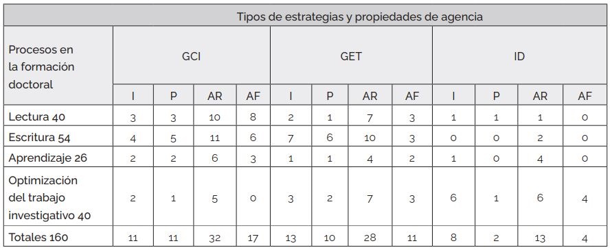 El desarrollo de agencia se analizó en función de las siguientes propiedades visualizadas en las distintas estrategias llevadas a cabo por los doctorandos: intencionalidad (I), previsión (P), autorregulación (AR) y autorreflexión (AF), como se observa en la Figura 1.