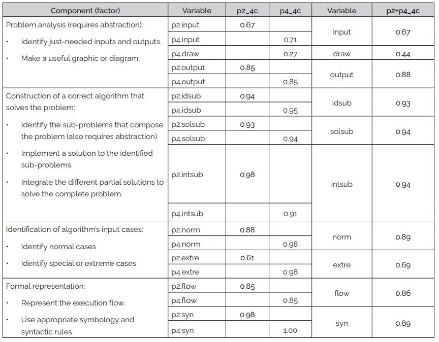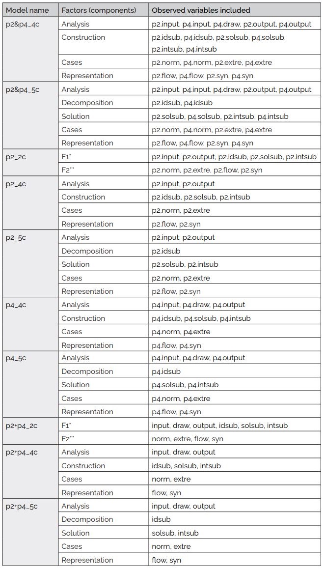 In this study, the CFA conducted on undergraduate students (aged 17-33) led to an operational definition for AT composed of four components: Problem analysis, algorithm construction, input cases identification, and algorithm representation (as shown in Table 7). This result is confirmed by the good psychometric properties of the three four-factor models, with the two problems considered separately, p2_4c and p4_4c, and with the averaged results from both problems, p2+p4_4c (see Table 6).
