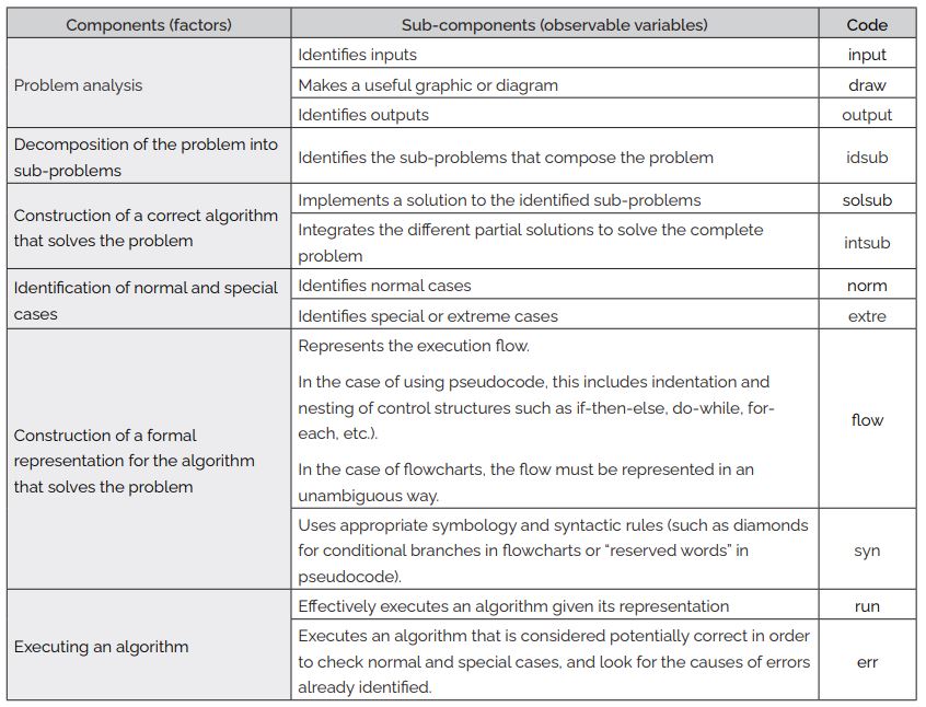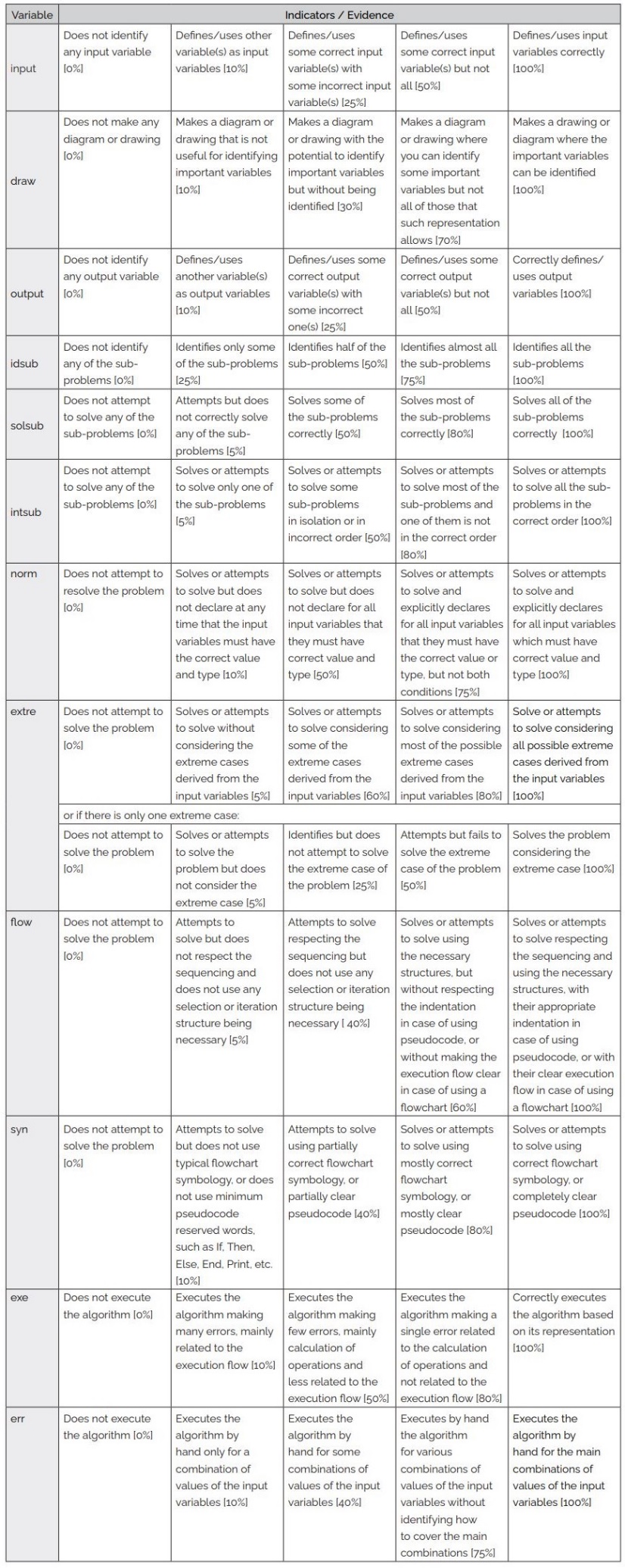 Although some more or less precise recent operational definitions have been proposed for AT (Juškevičienė & Dagienė, 2018; Lafuente Martínez et al., 2022; Park & Jun, 2023), these do not include a specific (or general) rubric to assess performance levels for each of the components or factors these operational definitions claim to compose the AT construct.