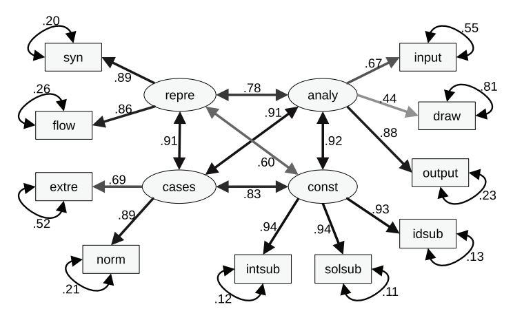 These results provide more detail than the two-factor model (problem representation and problem-solving) by Ortega Ruipérez and Asensio Brouard (2021) for adolescents and the unifactorial model by Lafuente Martínez et al. (2022) for adults. However, comparability with Bubica and Boljat (2021) and Sung (2022) is limited, as both focus on children, and their models' factor loadings and psychometric properties are unsatisfactory. This may be due to children's ongoing cognitive development, as Sung (2022) notes. Indeed, higher-order thinking skills, such as complex problem-solving, develop as children transition to adolescence (Greiff et al., 2015).