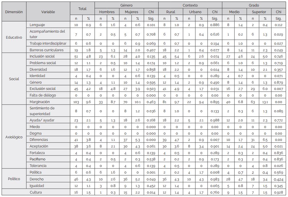 Respecto al área de conocimiento, se advirtió que el que cursa ciclos del área de Artes reportó en mayor medida 9 variables, el Biosanitarias 8 y tanto el de Ciencias Sociales como el de Científico Tecnológico 3, respectivamente. No obstante, tras realizar la prueba de χ2 se advirtió que el valor de la significancia fue inferior a 0.05 respecto a las variables: trabajo interdisciplinar, problema social, identidad, género, falta de diálogo, ayuda, miedo, dogma, política y cultura (ver Tabla 3); lo que evidencia que estas variables no son significativas.