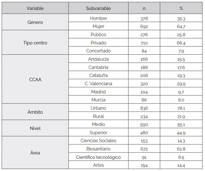 A partir de un universo de 984.353 estudiantes de ciclos formativos de España, se seleccionaron 1.070 estudiantes de 13 centros educativos (ver Tabla 1) con edades comprendidas entre los 15 y los 53 años (x = 21.09; DT = 6.1) a través de un muestreo aleatorio simple (nivel de confianza 99 %; margen de error 5 %). Se realizó una investigación mixta a través de un diseño descriptivo, no experimental y transversal.