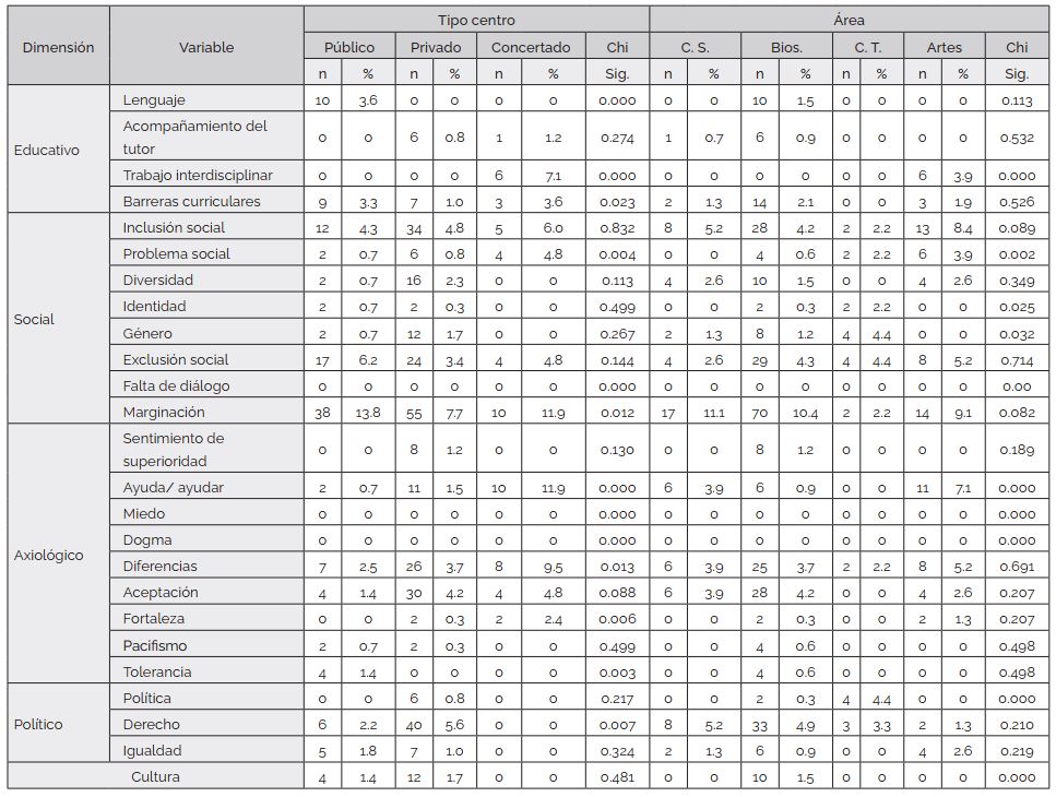 Con relación al tipo de centro, se observó que el alumnado matriculado en centros concertados reportó en mayor medida 9 variables, el de centros públicos 7 y el de privados 6. No obstante, tras realizar la prueba de χ2 se advirtió que el valor de la significancia fue inferior a 0.05 respecto a las variables: lenguaje, trabajo interdisciplinar, barreras curriculares, problema social, falta de diálogo, marginación, ayuda, miedo, dogma, diferencias, fortaleza, tolerancia y derecho (ver Tabla 3); por lo cual se rechaza la hipótesis de que estas variables son determinantes.
