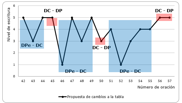 En la codificación del texto elaborado por la residente participaron los autores del trabajo. El texto fue analizado considerando como unidad de análisis la oración, definida por sus límites gramaticales. Cada oración fue identificada para su estudio siguiendo el orden secuencial en el texto (O1, O2, O3, etc.).ii Las oraciones fueron agrupadas por los investigadores según el objeto de análisis de la practicante en cuatro secuencias temáticas: presentación (primera secuencia) (O1-O13); análisis de la tabla (segunda secuencia) (O14-O28); corrección de la actividad (tercera secuencia) (O29-O41) y propuesta de cambios (cuarta secuencia) (O42-O57). Para los fines de este estudio, se optó por examinar en detalle la segunda y cuarta sección temática ya que solo en ellas se evidenciaron relaciones entre dominios.