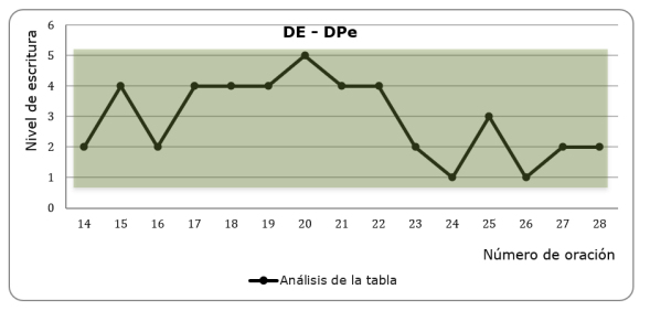 En la secuencia temática correspondiente al análisis de la tabla, la practicante expresa una relación entre los DE-DPe. Esta relación se extiende en un fragmento relativamente extenso (O14-O28) en el que prevalece la escritura modélica didáctica. Si bien, en este fragmento, también se presenta una de las modalidades de escritura descriptiva, esta debe ser interpretada en el contexto más amplio del análisis, expresado en términos de las restantes modalidades de escritura de nivel superior. Por otra parte, la presencia de la modalidad de escritura crítica se expresa en implicaciones para los estudiantes derivadas del análisis didáctico que realiza la residente. En estos términos, esta secuencia temática puede ser leída como centrada en un análisis que prioriza una reflexión dialógica didáctica en relación con una escritura descriptiva y una escritura crítica. En este sentido, y si bien la relación entre los dominios DE-DPe supone una mediación reflexiva en el MICPD, permanecer en este nivel de análisis impide dar cuenta de cómo, esta mediación, se expresa en una red de relaciones entre modalidades de escritura. Esta red permite dar cuenta de la complejidad del análisis de la residente. Esta última modalidad, utilizada en el análisis del texto elaborado por la practicante, permitió profundizar en cómo desarrolló su análisis al relacionar, en este caso, los DE y DPe. En esta secuencia, el análisis de la residente evidenció la centralidad del DE como fuente para tensionar su DPe. Esta relación entre dominios se presentó durante la escritura en el contexto de las interacciones con el docente de la asignatura y con su pareja pedagógica. El DE fue la única fuente de cambio a partir de la cual se tensionó el DPe. En la otra secuencia analizada, la residente inscribió las relaciones entre Dominios considerando su DPe como fuente.
