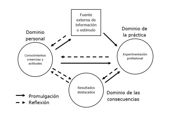 El MICPD, propuesto por Clarke y Hollingsworth (2002), ofrece un marco teórico potente para comprender el desarrollo profesional de los docentes. Este modelo reconoce la complejidad del crecimiento profesional y propone que este se produce a través de la reflexión y la promulgación de cambios en cuatro dominios interrelacionados: el dominio personal (conocimientos, creencias y actitudes), el dominio de la práctica (experimentación profesional), el dominio de las consecuencias (resultados salientes) y el dominio externo (fuentes de información o estímulo) (Figura 1).