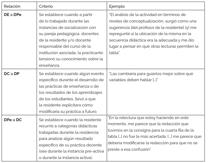 Los dominios del MICPD fueron adaptados al contexto de la investigación. El dominio de la práctica (DP) fue definido considerando instancias pre-activas (planificación, por ejemplo) y activas de la enseñanza, recuperando la propuesta de Zwart et al. (2007). Para el dominio de las consecuencias, se distinguieron entre dos modalidades: una de ellas, correspondiente a las instancias en las que la practicante recuperó eventos relevantes durante la etapa pre-activa; la restante, referida a eventos de su práctica de enseñanza en el aula. En la Tabla 1 se presentan y ejemplifican las relaciones entre Dominios identificadas en el estudio.