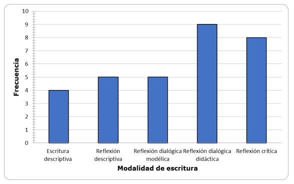La escritura se expresó en diferentes modalidades, entre las cuales, la más frecuente corresponde a la reflexión dialógica didáctica. En la Figura 5 se presentan las frecuencias asociadas a cada una de las modalidades de escritura presentes en el texto elaborado por la futura profesora. Las modalidades dialógicas, en su conjunto, y la crítica, presentaron frecuencias de codificación que permiten reconocer una profundidad, en el análisis de la practicante, que contrasta con resultados de investigaciones en las que se evidencia una presencia excluyente de las modalidades no reflexiva (escritura descriptiva) frente a las restantes (Figura 5).