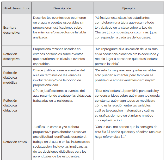 El recurso didáctico a partir del cual la residente analizó su práctica es una herramienta frecuentemente empleada en las aulas por los profesores de química. En esta línea, en primer término, radica la importancia de su análisis al estar centrado en un recurso que, probablemente, recuperará en sus futuras prácticas de enseñanza. Los resultados muestran que la practicante logró articular diversos conocimientos didácticos, como los niveles de conceptualización (Taber, 2013), la contextualización/descontextualización de las actividades y la condensación de significados, para analizar críticamente la tabla de doble entrada utilizada en sus clases. Esto evidencia cómo el dispositivo de escritura reflexiva posibilitó a la residente recuperar y resignificar saberes construidos durante su formación inicial, para interpretar un aspecto específico de su práctica docente (Jarpa Azagra et al., 2019).