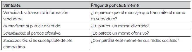 Dado que los memes pueden transmitir una gran cantidad de significados, y, por ello, pueden ser analizados a partir de distintas perspectivas, en este estudio se eligieron los siguientes aspectos: veracidad (si transmite información verdadera), humorismo (si parece divertido), sensibilidad (si parece ofensivo) y socialización (si es susceptible de ser compartido en redes sociales). Estos aspectos se explican a continuación.