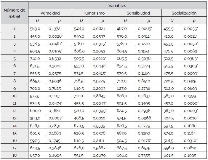 Se encontraron diferencias estadísticamente significativas entre las apreciaciones de docentes y estudiantes en 12 de los 18 memes que formaron parte del cuestionario; estos resultados se muestran a continuación en la Tabla 2, que indica los valores de la prueba U Mann-Whitney (n = 82: 26 docentes, 56 estudiantes). Se observa que para la variable veracidad, 5 memes presentan diferencias estadísticamente significativas entre las percepciones de docentes y estudiantes (memes 2, 3, 4, 11 y 13); para el humorismo, 8 memes (3, 5, 6, 7, 11, 12, 13, 15); para la sensibilidad 3 memes (1, 2, 16); para la socialización 11 memes (1, 2, 3, 4, 5, 6, 7, 11, 12, 13, 16).