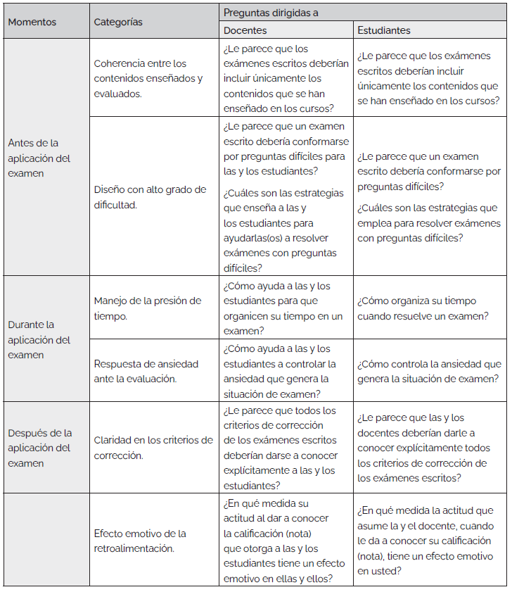 Para elaborar esta guía de entrevista (ver Tabla 3) se incluyeron, en la columna titulada Categorías, ciertos elementos interpretativos que se pueden inferir de los mensajes que transmiten los memes del instrumento empleado, ya que, como muestran los resultados, estos memes permiten aproximarse a cómo es que las personas con un rol de actores educativos perciben la evaluación a través de exámenes escritos.