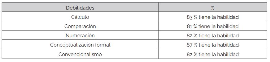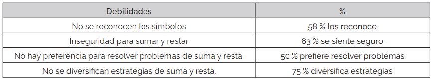 Con la aplicación de la encuesta y el Test de Competencia Matemática Básica se identificaron una serie de debilidades en los estudiantes de primer grado del Centro Educativo Marpi, con respecto a los resultados encontrados en la encuesta. Estas se detallan en la Tabla 1: