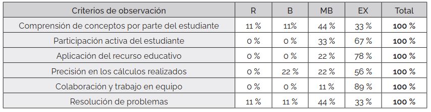 Con respecto a la comprensión de conceptos por parte del estudiante, los resultados indican una asimilación de los conceptos enseñados, lo que sugiere un compromiso activo por parte de los estudiantes en su proceso de aprendizaje y una mejora en su capacidad para aplicar los conocimientos adquiridos. En el caso de la participación activa, los resultados reflejan un alto grado de compromiso y entusiasmo por parte de los estudiantes en su proceso de aprendizaje, lo que contribuyó positivamente al ambiente de aula y al desarrollo de habilidades colaborativas.