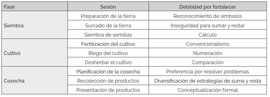 La estrategia pedagógica de la Shagra se diseñó con base en las debilidades detectadas en el diagnóstico y se implementó durante nueve sesiones distribuidas a lo largo de un período de tiempo determinado de tres meses. Cada sesión se diseñó cuidadosamente para abordar aspectos específicos del aprendizaje de la suma y resta, utilizando actividades prácticas y contextualizadas en el entorno de la Shagra. Además, cada sesión se implementó en asignaturas como Matemáticas y Educación Indígena con una duración de 120 minutos por cada una.