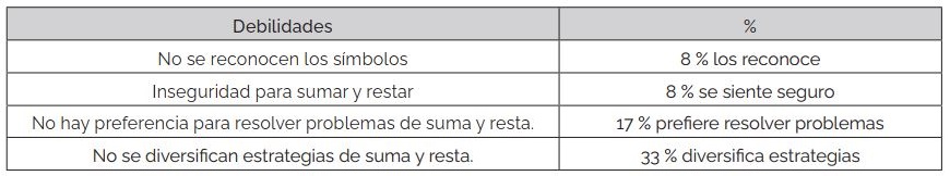 Otra debilidad detectada es la inseguridad que tienen los estudiantes al ejecutar estas operaciones básicas. Esta falta de confianza obstaculiza el proceso de aprendizaje y afecta negativamente la capacidad de los estudiantes para abordar problemas matemáticos con seguridad y precisión. Una debilidad adicional es la falta de preferencia por resolver problemas de suma y resta entre los estudiantes. Esta falta de inclinación puede reflejar una falta de interés o motivación hacia las operaciones matemáticas básicas, lo que podría afectar su compromiso y desempeño en esta área.