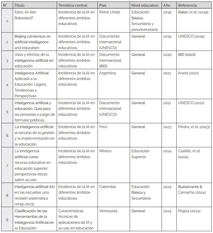 Respecto a los nueve textos que finalmente fueron seleccionados para el análisis, la temática central que cada uno de ellos aborda no tiene una muy amplia dispersión, por el contrario, solo dos tipos de temáticas centrales fueron identificadas: incidencia de la IA en diferentes ámbitos educativos y características técnicas de aplicaciones de IA y su uso en educación. Del total, ocho documentos presentan, como tema central desarrollado, la incidencia de la IA en diferentes ámbitos educativos; mientras que uno refiere a las características técnicas de aplicaciones de IA y su uso en educación (ver Tabla 3).