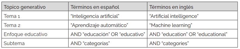 Para el diseño de estas ecuaciones de búsqueda nos basamos en los aportes y recomendaciones de Zawacki-Richter et al. (2020) para el caso de revisiones sistemáticas en investigación educativa, también en los aportes y recomendaciones de Marín (2022) para el desarrollo de estudios en el campo de tecnología educativa. Asimismo, tomamos como referencia las ecuaciones de búsqueda aplicadas en algunas investigaciones recientes que también realizaron una revisión sistemática en el ámbito de la IA y educación, el más significativo y actual es el caso del estudio de Forero-Corba & Negre (2024).
