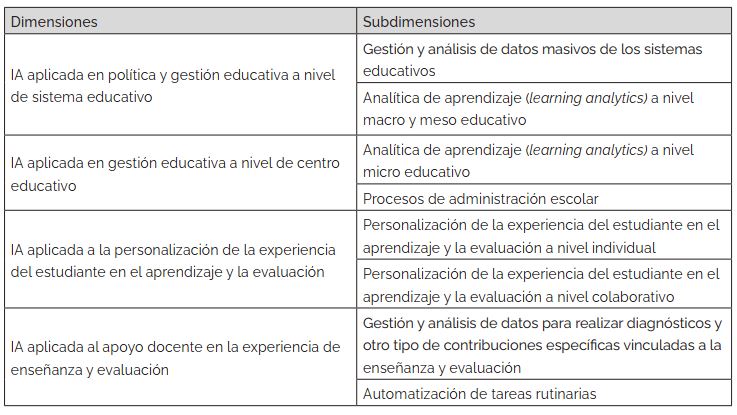 Por su parte, el documento “Inteligencia artificial y educación. Guía para las personas a cargo de formular políticas” (UNESCO, 2021) propone las siguientes dimensiones:
