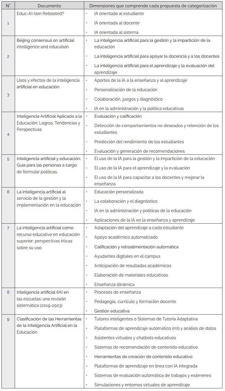 El uso cada vez más amplio e intenso de inteligencia artificial en el ámbito educativo ha conducido a un aumento exponencial de las investigaciones en esa área. Tanto la aplicación de inteligencia artificial en educación como las investigaciones realizadas al respecto recaen sobre diferentes dimensiones de lo educativo, que van desde la gestión a nivel de sistema educativo hasta los procesos de aprendizaje personales de los estudiantes. Si bien existen algunas propuestas de categorizaciones que permiten ordenar, clasificar las diferentes aplicaciones de inteligencia artificial en educación y las investigaciones que de allí se derivan, son propuestas demasiado amplias y, en cierta medida, indefinidas en sus estructuras. A través de un proceso de revisión sistemática, se analizaron diferentes propuestas de categorización referidas al binomio inteligencia artificial – educación, con el fin de llegar a la construcción de una propuesta que incluya a las ya existentes, pero también las trascienda. El resultado es la creación de una categorización estructurada en cuatro dimensiones y ocho subdimensiones, que puede ser utilizada en todos los niveles educativos y es válida tanto para clasificar herramientas de inteligencia artificial aplicadas en educación como también investigaciones sobre la temática.