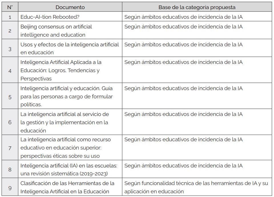 El hecho constatado de que solo uno de los nueve documentos examinados no tenga como temática central de estudio la incidencia de la IA en diferentes ámbitos educativos es importante, dado que indica la tendencia general de investigación en el tema específico que estamos analizando, la cual se inclina de forma contundente hacia los sujetos y/o procesos educativos más que hacia las dinámicas propiamente funcionales de la IA en educación. Como consecuencia de y en coherencia con lo anterior, todas las propuestas de categorías, menos una, toman como eje los ámbitos educativos de incidencia de la IA en lugar de la funcionalidad técnica de las herramientas de IA y su aplicación en educación.