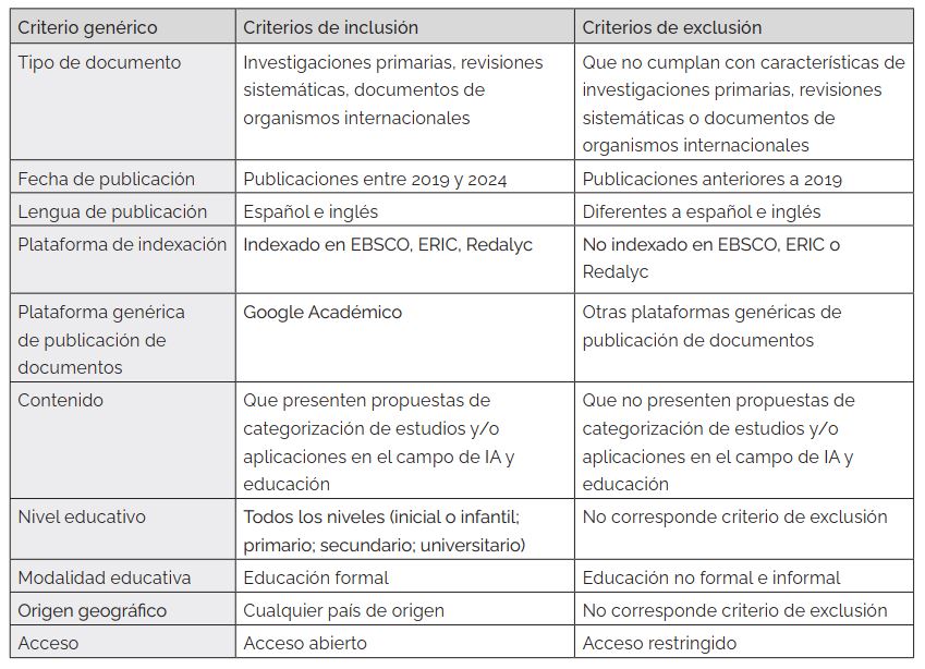 Respecto a la fase 3, los criterios de inclusión y exclusión de los documentos se basan en las recomendaciones de Marín (2022) y Zawacki-Richter et al. (2020); resultando la siguiente configuración que se muestra en la Tabla 1.
