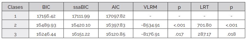 El análisis de los perfiles estudiantiles se realizó mediante un análisis de perfiles latentes. La interpretación de los modelos se efectuó a través de los índices Bayesian Information criteria (BIC), sample size adjusted BIC (ssaBIC), Akaike Information Criteria (AIC), para los cuales valores bajos se corresponden con un mejor ajuste (Schreiber, 2017). Las mejoras significativas de un modelo de mayor número de perfiles respecto de uno de menor número se realizaron a través de la lectura de los índices Vuong-Lo-Mendel-Rubin (VLMR) y Lo-Mendell-Rubin (LMR) (Spurk et al., 2020; Weller et al., 2020).