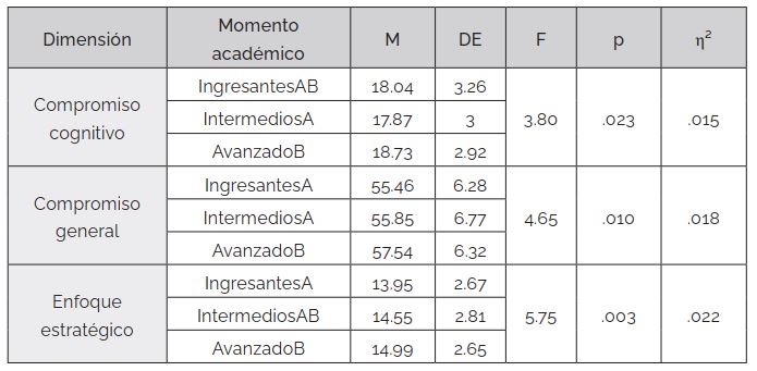 Para el análisis de diferencias según momento académico se agruparon los estudiantes en ingresantes (primer y segundo año), intermedios (tercer año) y avanzados (cuarto y quinto año), a fin de comparar grupos homogéneos. Luego, se aplicó una prueba ANOVA one way con el método robusto de Welch, debido a que no se cumplió el supuesto de normalidad (Delacre et al., 2017). Se verificaron diferencias estadísticamente significativas en las variables de Compromiso Cognitivo, Compromiso General y el Enfoque Estratégico (ver Tabla 1).
