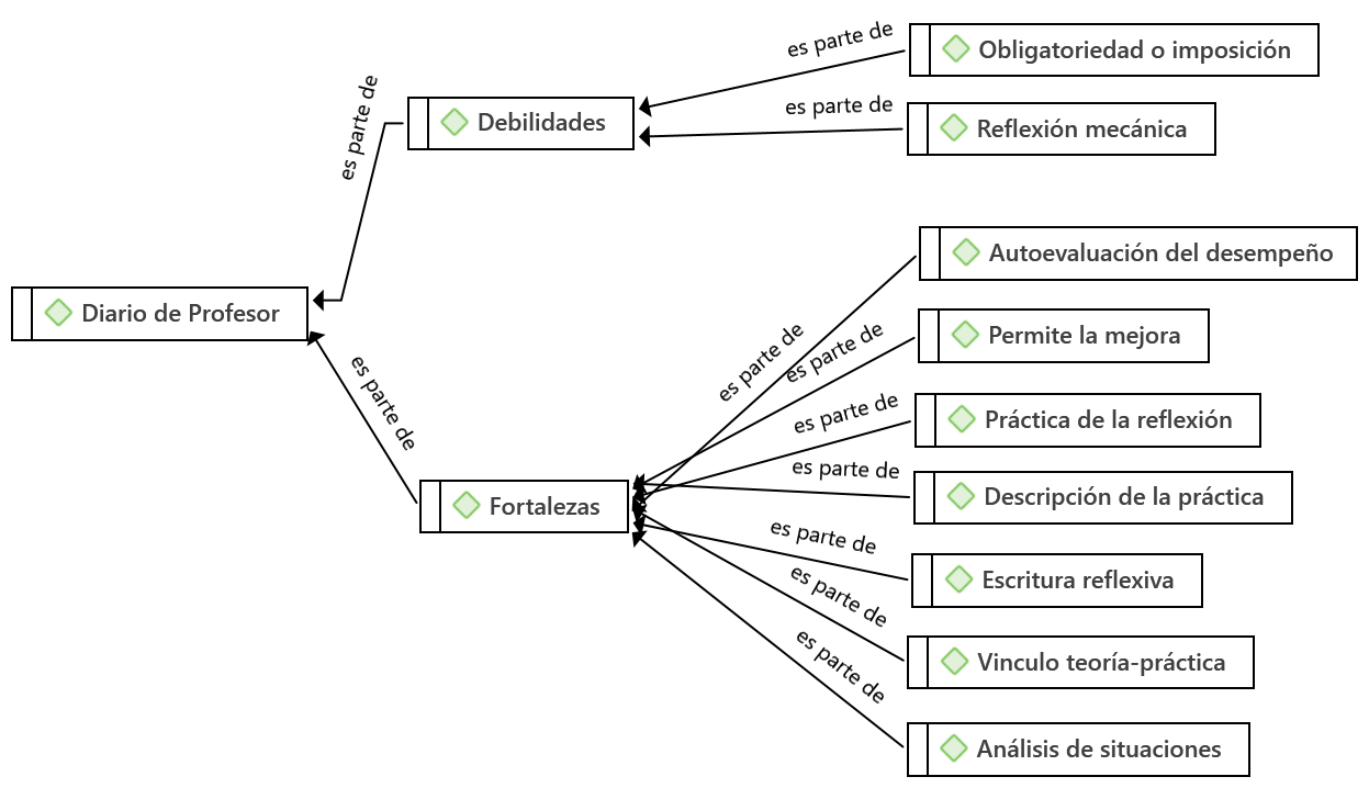 En la red se presenta la subcategoría Debilidades del diario, que muestra los aspectos que el estudiantado destaca como débiles o negativos de la implementación de esta herramienta reflexiva en su proceso de formación profesional. La subcategoría, se encuentra constituida por dos códigos: Obligatoriedad o imposición y Reflexión mecánica.