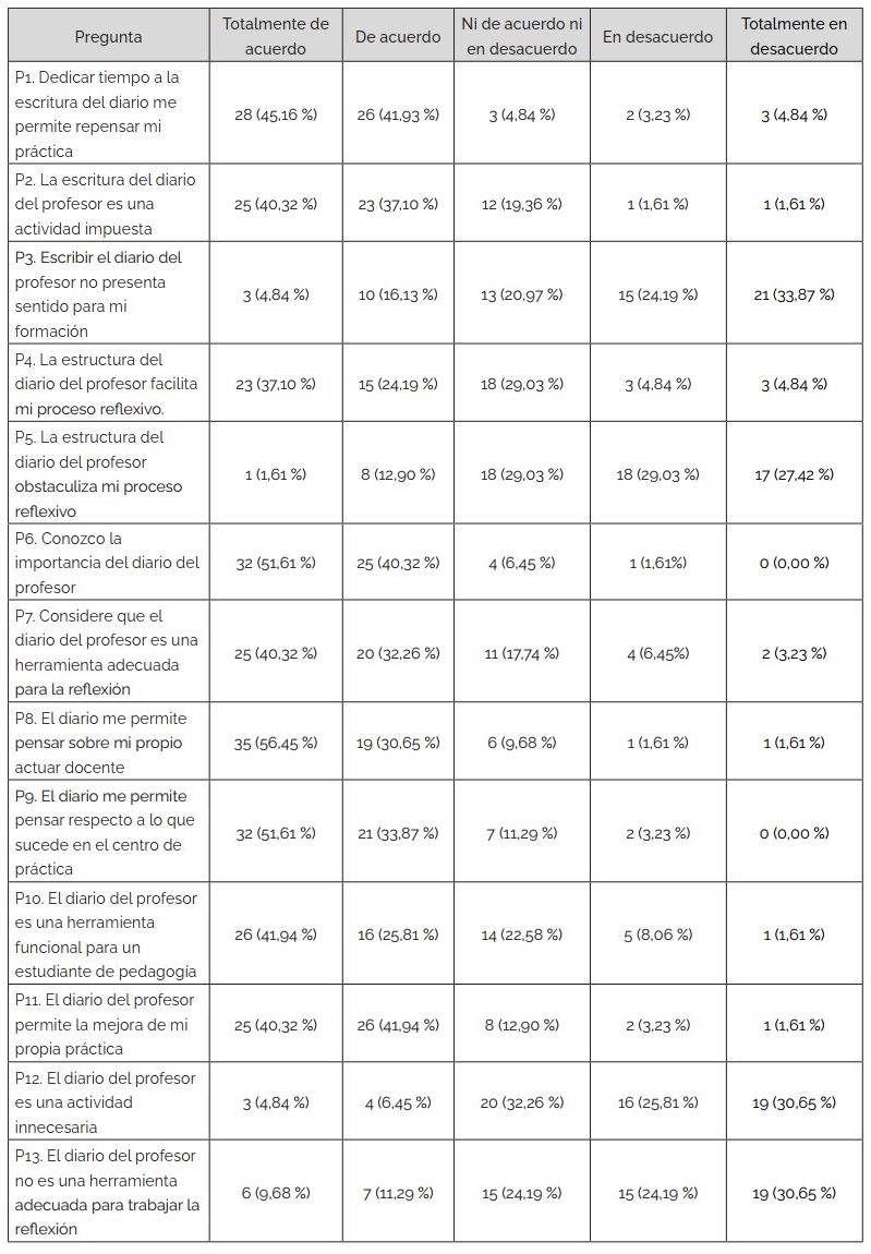 Para el desarrollo del estudio, en su fase cuantitativa, se diseñó un cuestionario estructurado en dos secciones. La primera, presenta un apartado cuantitativo compuesta por una escala Likert de cinco puntos de respuesta: 5) Totalmente de acuerdo, 4) De acuerdo, 3) Ni de acuerdo ni en desacuerdo, 2) En desacuerdo y 1) Totalmente en desacuerdo. La escala está compuesta por 13 ítems, este instrumento se utilizó para medir las percepciones del estudiantado sobre la herramienta reflexiva diario del profesor. Los ítems se agruparon en percepciones con sentido positivo (ítems 1, 4, 6, 7, 8, 9, 10 y 11) y percepciones con sentido negativo (ítems 2, 3, 5, 12 y 13).