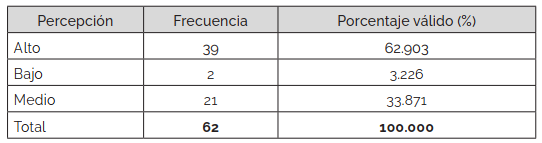 Sumado al análisis de frecuencias y porcentajes, se presenta un análisis de los baremos de la escala Likert, Para ello se han levantado tres baremos, donde la Percepción baja presenta puntuaciones entre 12 y 30 puntos; la Percepción media presenta puntuación entre 31 y 47 puntos, finalmente, la Percepción alta evidencia puntuación entre 48 y 65 puntos.