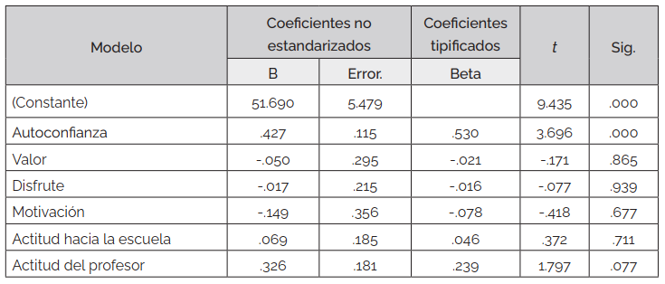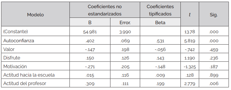 1. ¿En qué medida predicen la autoconfianza, el disfrute, la motivación, el valor de las matemáticas, la actitud percibida del docente y la actitud hacia la escuela, el rendimiento académico en matemáticas de los estudiantes de secundaria?