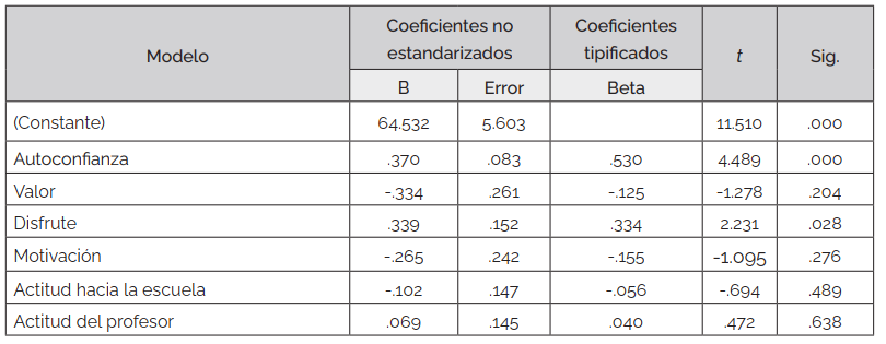 Autoconfianza (β = .370, p = .000), y Disfrute (β