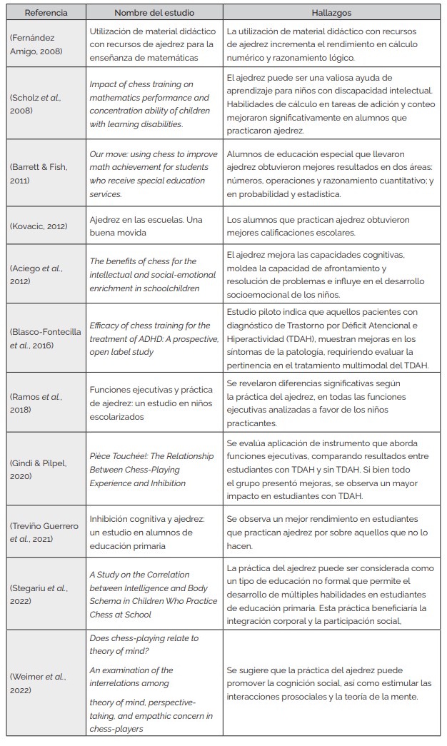 Experiencias relativas al uso del ajedrez vinculado con el aprendizaje y la cognición permiten observar diferentes aproximaciones en torno a la enseñanza y práctica del ajedrez, principalmente en contextos escolares o con personas en edad escolar; evidenciando dos tópicos principales: fortalecimiento del sistema ejecutivo y la estimulación en habilidades socio-emocionales (ver Tabla 1).