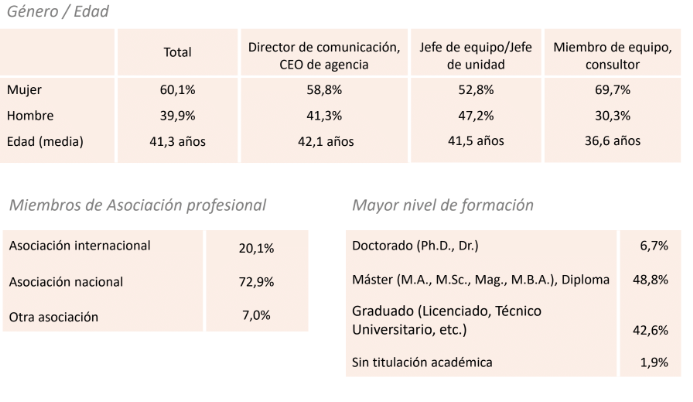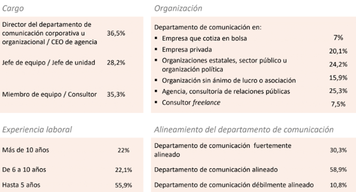 Dos tercios de los profesionales entrevistados trabajan en departamentos de comunicación en organizaciones (7% en empresas con acciones en la bolsa de valores, 20,1% en empresas privadas, 24,2% en la administración pública u organizaciones políticas y 15,9% en el tercer sector). Mientras que el 32,8% trabaja en agencias o como freelancers.