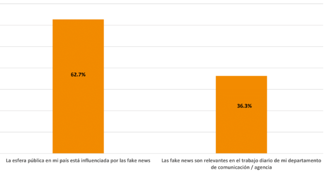 Sin embargo, a pesar del conocimiento y del debate existente, las fake news parecen no estar tan presentes en la rutina de los profesionales de la comunicación: apenas el 36,4% considera que son relevantes en su trabajo cotidiano y solamente el 23,3% identifica este problema como una de las principales cuestiones estratégicas de la profesión.
