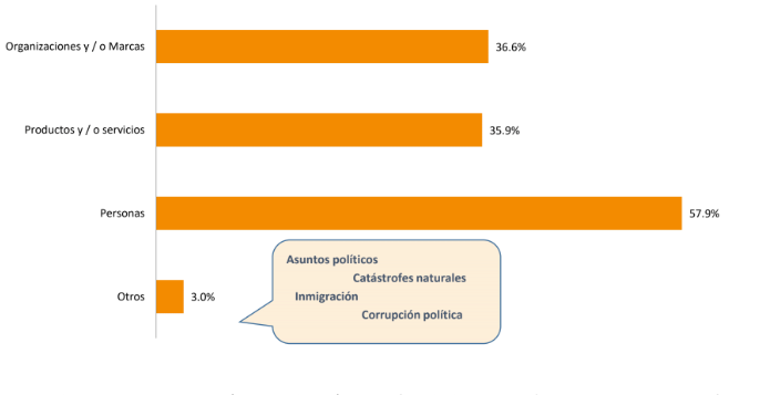 Los temas y los sujetos de estas noticias deliberadamente erróneas son consideradas generalmente personas específicas y temas (57,9%), pero también las propias organizaciones y sus marcas asociadas (36,6%), así como sus productos y servicios (35,9%), aparecen indicadas por los profesionales que participaron en el LCM 2018-2019.